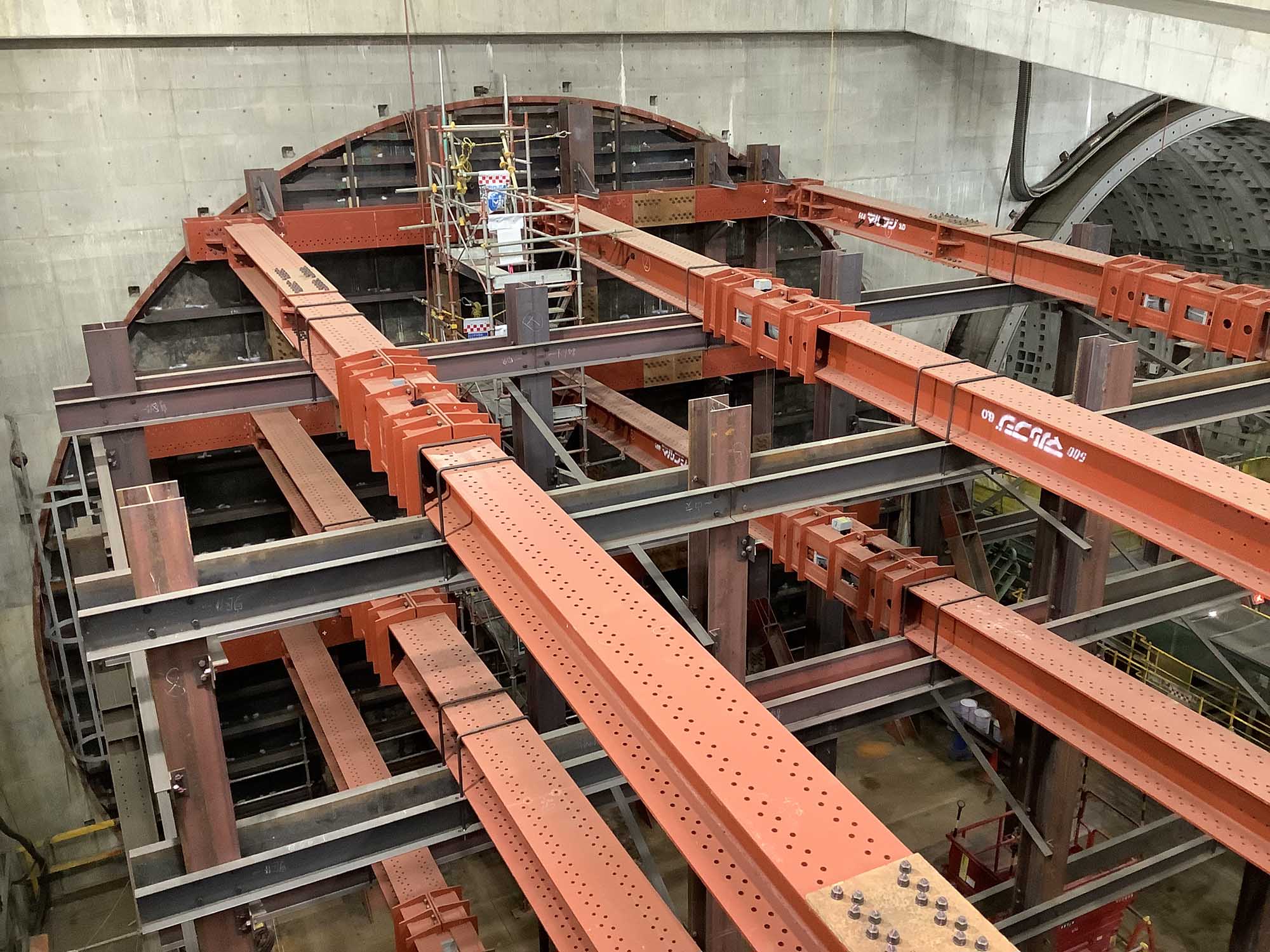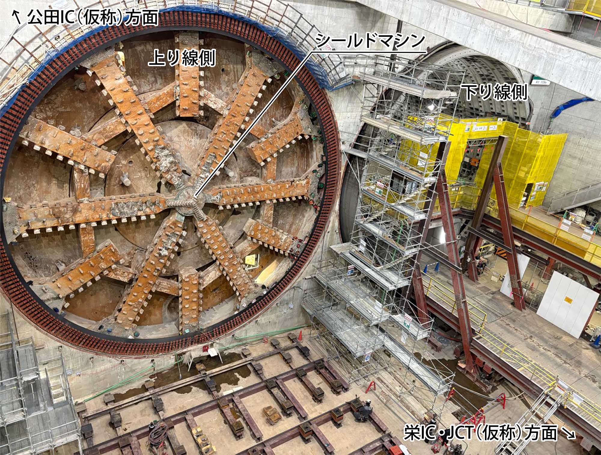 令和7年10月10日(金)に、シールドマシンは上り線の掘進を終え、発進到達立坑に到達しました。 引き続き、主な作業を以下のステップに分類して工事を進めています。 【ステップ1】シールドマシンの引き抜き作業 ←現在作業中 【ステップ2】シールドマシンの解体作業 【ステップ3】立坑内の内部構築作業等